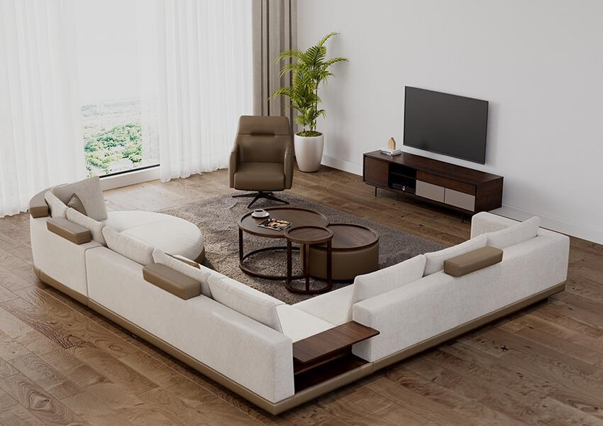 Stylish Combination of Fabric, Leather, and Wood to create a minimal and modern look in home décor