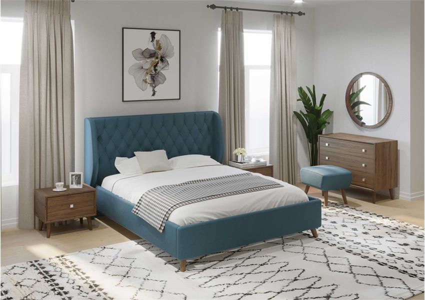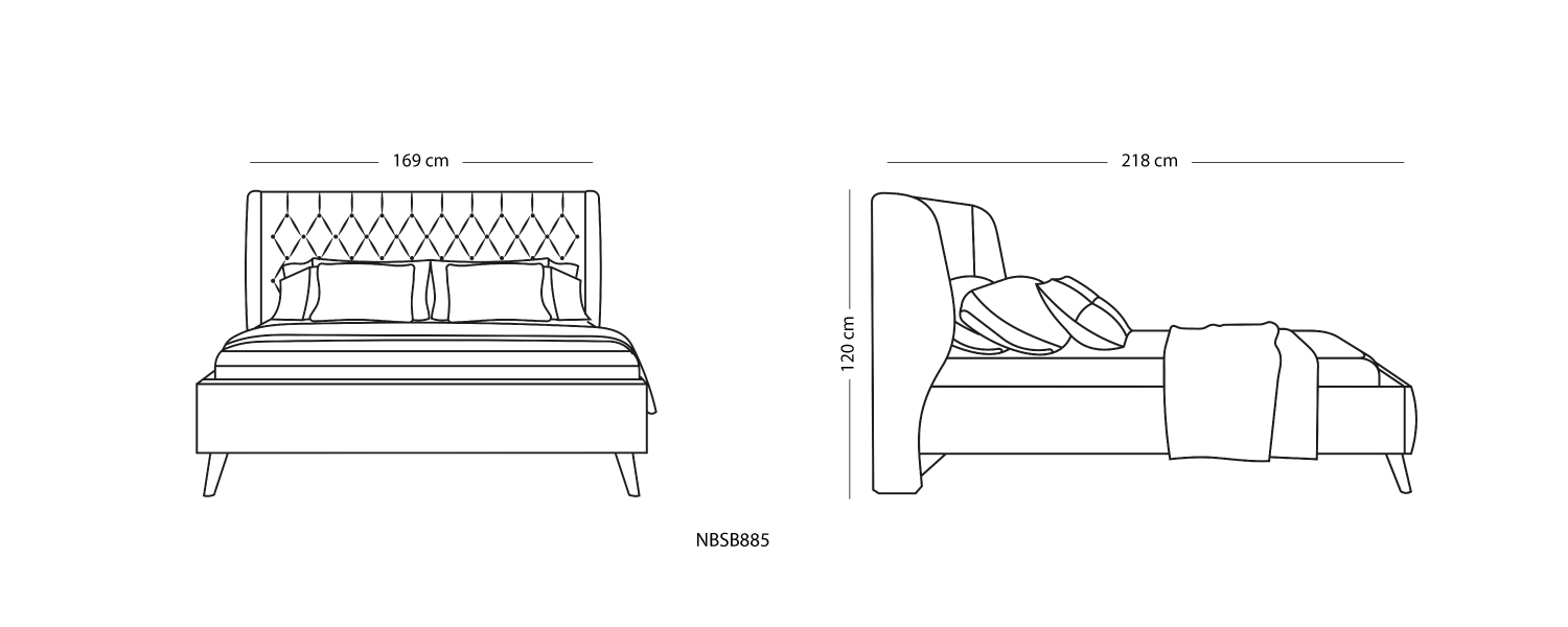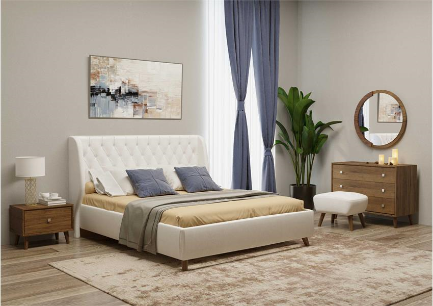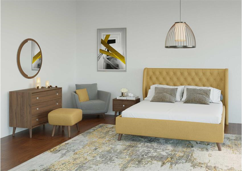 تاج و تمامی قسمت های چوبی تخت ساخته شده از MDF با روکش پارچه و پایه های ساخته شده از چوب راش