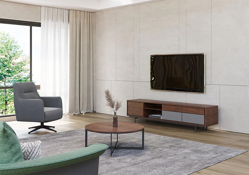 میز تلویزیون الوند با بهره گیری از ترکیب چوب و فلز در سبک مدرن طراحی شده است.
